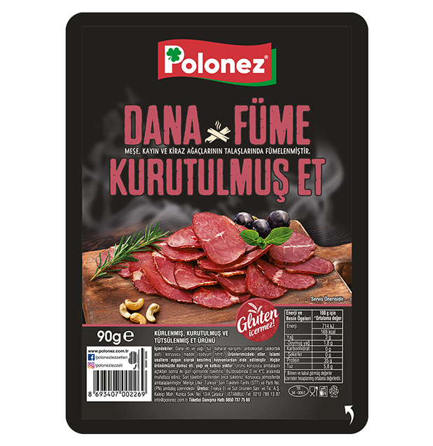 Polonez’in özel seçilmiş taze dana bonfile ve kontrafile etlerinin tuz ile kaplanıp, kürlenip, doğal gürgen, meşe odun  talaşları ile kurutulmasıyla ile üretilmektedir.